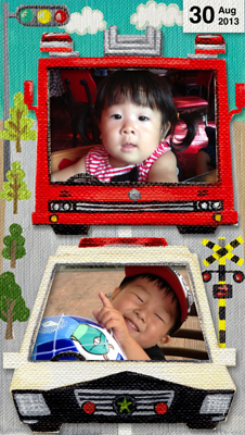 この写真に写っているのはわたしの甥っ子と姪っ子なのですが、二人とも乗り物が大好きで、わたしの周りにいる子供たちも乗り物が大好きだったので、みんなに喜んでほしいと思い、このフレームを考えました。