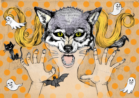 おばけたちのたくらみ。その2。 今年もハロウィンがやってきた。ちっちゃいお化けたちが、今年こそは人間を驚かしてやろうと何やら企んでいます。 オオカミに変身させちゃおうか〜。牙や爪も伸ばしちゃえば、きっとびっくりするぞ!ウヒヒ。わらいが止まらない。 さてさて、成功するんでしょうか・・・。
