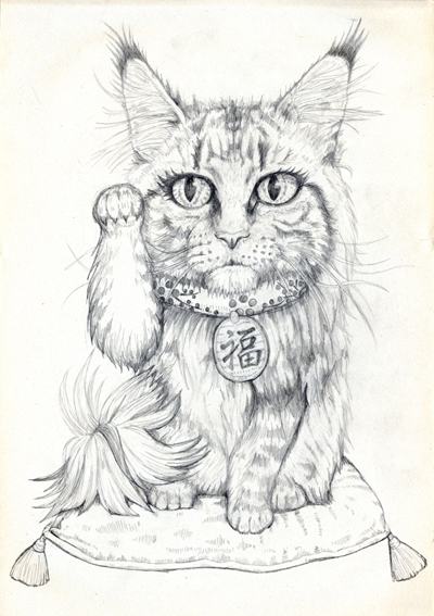 コンペ用にかいたもの。テーマ「East Meets West (東洋と西洋の出会い)」 日本の招き猫が「メインクイーン」になりました。 なんかちょっと変な感じ。 その変な感じを、そのままTシャツにしました。