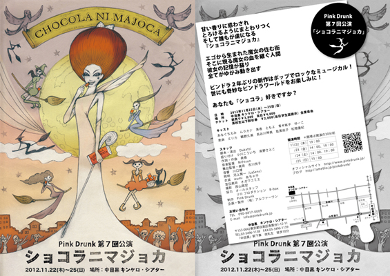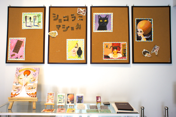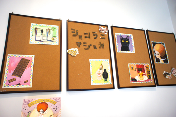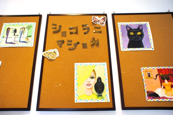 『Pink Drunk』の公演『ショコラニマジョカ』の会場ロビーで少し作品を展示しました。 チラシ用に作成したイラストとそのイメージを広げたアクリル画を数点です。 舞台を見に来たお客様に少し楽しんでいただけたらと思って制作しました。