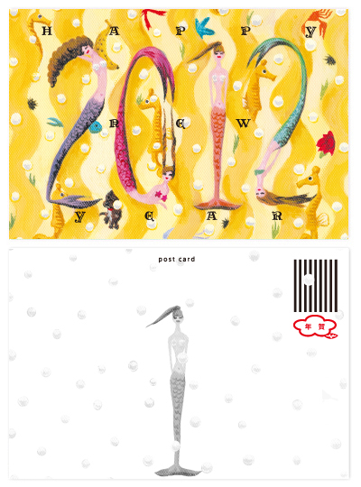 年賀状用に制作したカード。辰年なのでタツノオトシゴを使用し、黄色い海の中で楽しそうに人魚たちが人文字をしているようす。