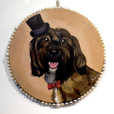 『green CIRCUS 』 展用に制作した作品。直径25cmの円形キャンバスで制作。サーカスの団長です。周りにパールのパーツをつけてみました。