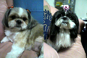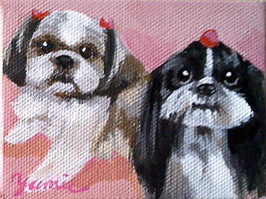 シーズの子たちです。二匹一緒にしました。ピンクのリボンが付いていたので、背景もピンクにしました。