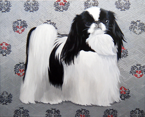挿し色の赤もどこに使おうか・・・実際、狆の画像を前にすると首輪にするのは何か違うのでは ないかと思えてきて、背景を文様にしてみました。
