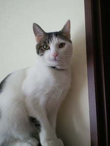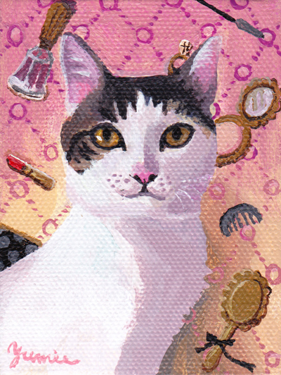 にゃんこのラッテです。キリリとした表情が素敵です。 美容関係のお仕事をしているお友達なので、背景に化粧品の小物をちりばめてみました。